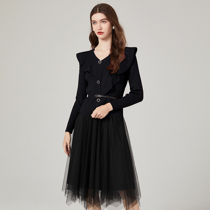 V-neck Lace-up Pleating Design Flower Stitching High Waist Dress
